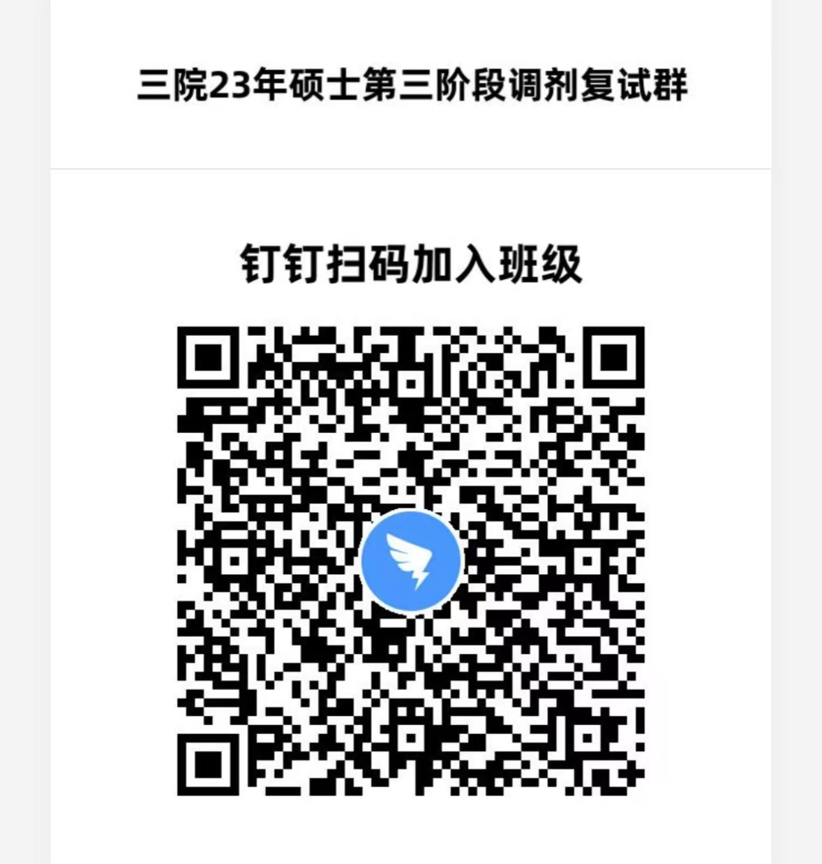 请在我院第三阶段复试名单中的考生,下载钉钉APP,实名注册认证,扫描以下钉钉二维码加入:三院23年硕士第三阶段硕士调剂次复试群。入群备注:考生编号-姓名,该群会有复试相关通知及问题答疑,请及时关注。