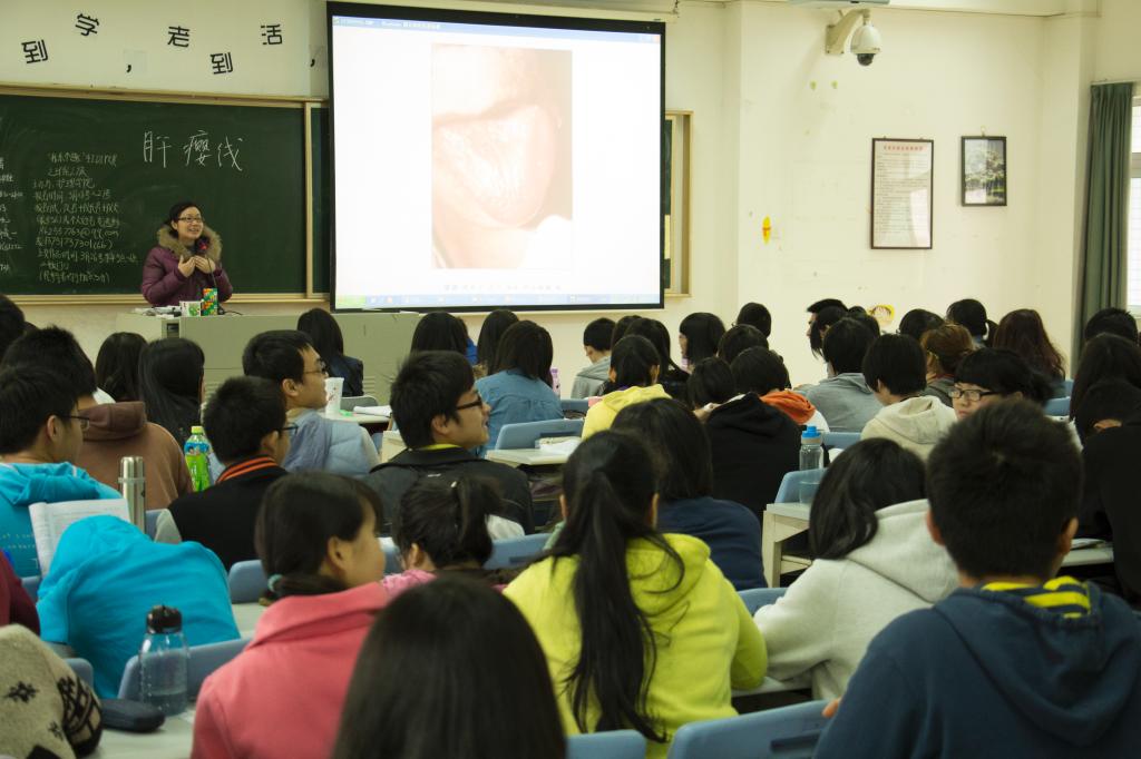 3月21日,学校宣传部简福爱部长走进我院2013级的课堂进行随堂听课,本堂课是由唐永祥教授讲授的中医诊断课----舌诊。