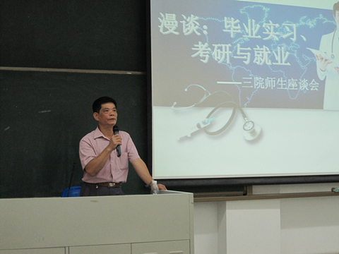 本次座谈会的主题为“漫谈毕业实习、考研和就业”。首先方院长强调,毕业实习是人生转折点的过渡阶段,是将理论知识运用于实践的阶段,希望同学们高度重视。方院长结合自身丰富的临床经验,给同学们提出了三点要求:一是要修身立德、尊师爱患。要求同学们做到修养身心,提高自身的思想道德修养水平,尊敬老师,爱护患者。二是要博极医源,夯实基础。要求大家务必扎实学好医学基础知识,深入探究医学根源。三是要自律自护,完善自我。同学们在临床上务必严格要求自己,自觉遵守各种规章制度,同时学会保护自己,不断提高和完善自身综合素质。对于考研的选择,方院长鼓励有条件的同学积极报考研究生,但同时要结合自身家庭情况、个人发展等实际情况综合考虑。在就业方面,方院长寄望同学们要“志存高远”,树立“先就业再择业”的就业观念,根据自己的实际情况来选择就业的方向和岗位。接着,方院长就医生的职业生涯、实习技巧、实习心理、就业心理等方面与同学进行了深入交流。