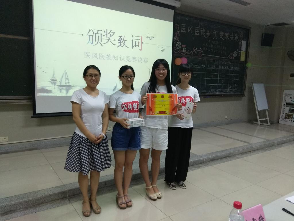 5月18日晚上7点,由伟德bv1946官网团委主办的“大医精诚---医德医风知识竞赛决赛”在综合楼101举行。基础医学院教授李先涛教授、三院学工办主任赵丽老师、兼职辅导员李雪梅老师、学生会主席林翠瑶、校自律部社务组组长及各学院的自律部部长等嘉宾出席。进入决赛的队伍有四支,分别是来自针康学院的“超Cute小仙女队”、第一临床医学院的“谢谢大家队”和“猜的都队”、第一临床医学院和第二临床医学院的混合选手“三仁汤队”。 获得本次比赛决赛的优秀奖的是“三仁汤队”、获得季军的是“超Cute小仙女队”、获得亚军的是“猜的都队”、获得冠军的是“谢谢大家队”。