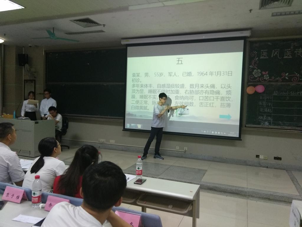 第二环节是医案分析,选医案题目后,各队伍成员有三分钟时间进行的讨论交流,随后派代表上台分析,限时一分钟。然后由李先涛教授统一对各队伍的医案分析进行点评。李先涛教授点评了选手的答案,并提醒同学们在分析病案时要注意抓主诉,要四诊和参。在这一环节后,比分暂时领先的是“三仁汤队”。