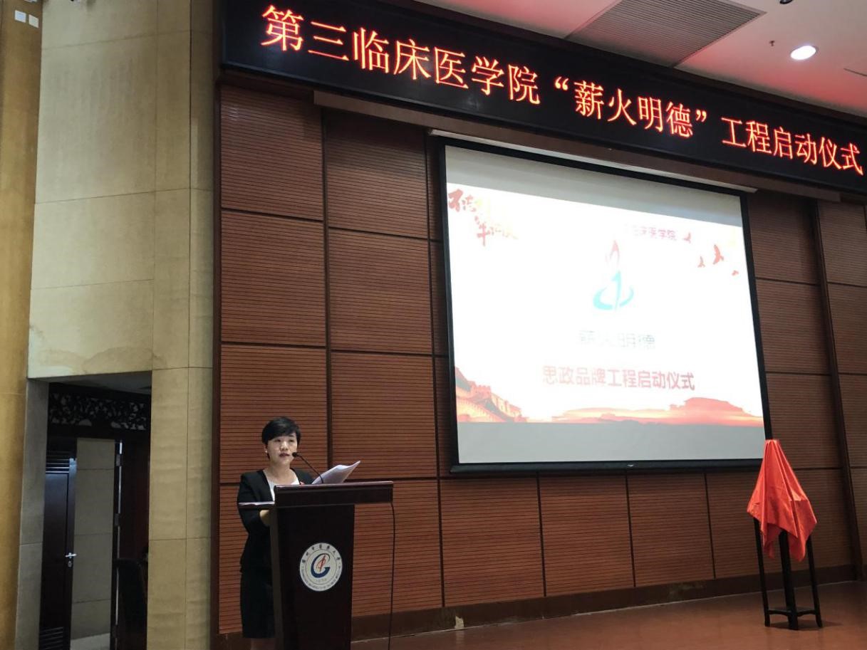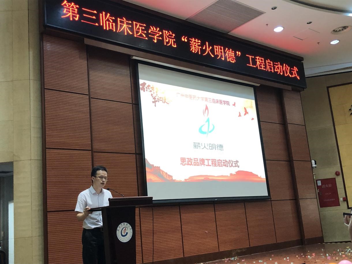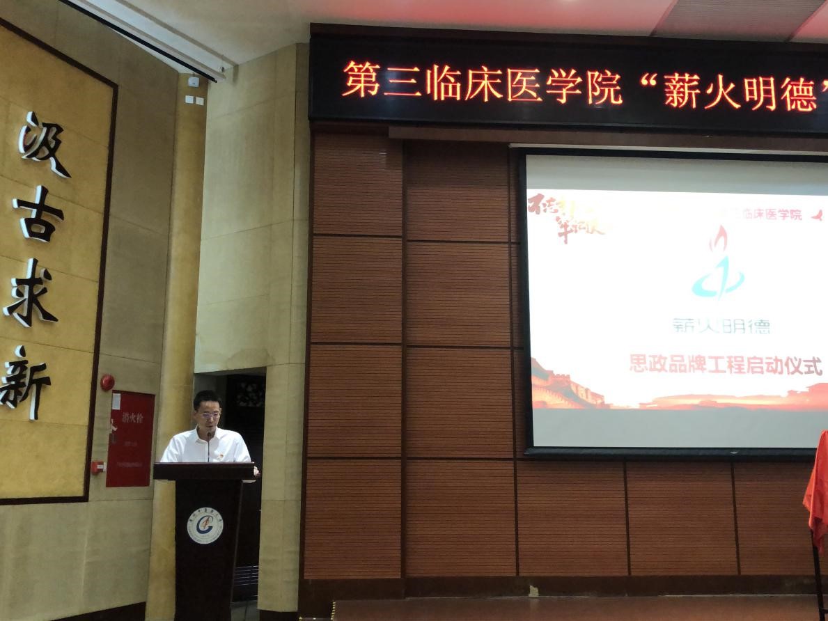 最后,学校党委邓国安副书记作总结发言,他对我院思政品牌“薪火明德”工程表示充分的肯定。他指出,目前全校正在开展“不忘初心,牢记使命”主题教育,作为高校肩负着“为党育人、为国育才”的任务,三院紧扣主题和重点工作,启动“薪火明德”工程非常有意义。习近平总书记在全国高校思想政治工作会议上强调“要坚持把立德树人作为中心环节,把思想政治工作贯穿教育教学全过程,实现全程育人、全方位育人,努力开创我国高等教育事业发展新局面。” 思想政治教育是一项长期系统的工程,需要常抓不懈。邓书记还对同学们提出两点希望和要求:一是要求同学们要树立远大的理想,将个人发展与国家命运紧密联系,努力践行社会主核心价值观,爱党、爱国、爱社会主义,坚定理想信念,响应祖国的召唤,增强责任意识和担当意识,牢记扎根基层、服务基层的时代使命。二是要努力学习,掌握过硬的本领。勤奋刻苦,学到扎实的本领,争做一名品学兼优、德才兼备的大学生,扎根基层、服务基层,努力成为德艺双馨的中医药卫生人才。