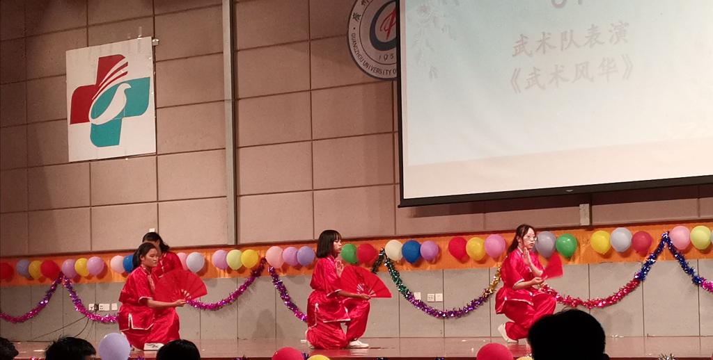 灯光汇聚,音乐响起,三院武术队的呐喊声令人热血沸腾。踢腿,弓步提膝冲拳,动作刚劲有力,势如破竹;陈氏太极拳,轻灵沉着,螺旋进退,刚柔相济,一招一式尽展中华武术魅力。中华武术名扬海外,中华儿女笑傲天下!