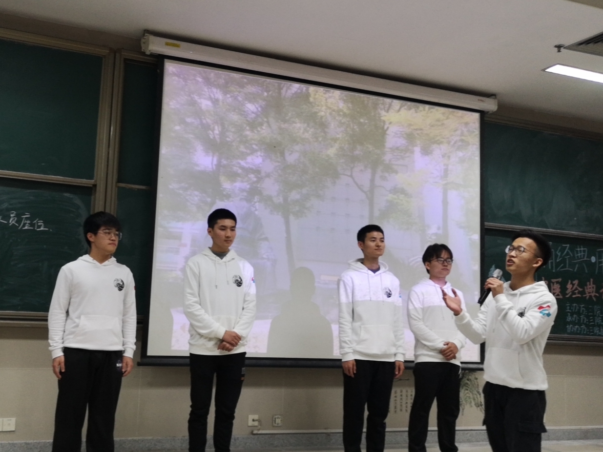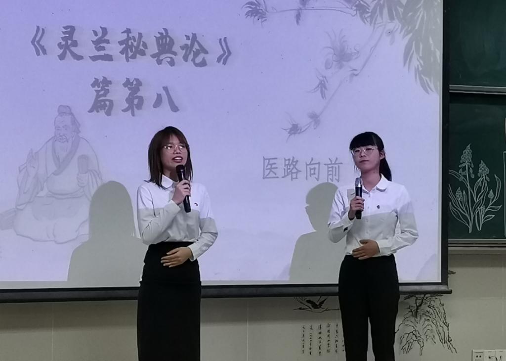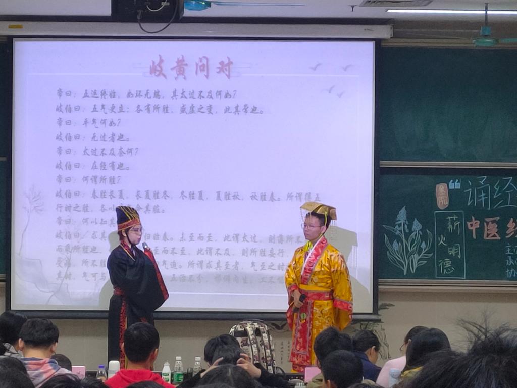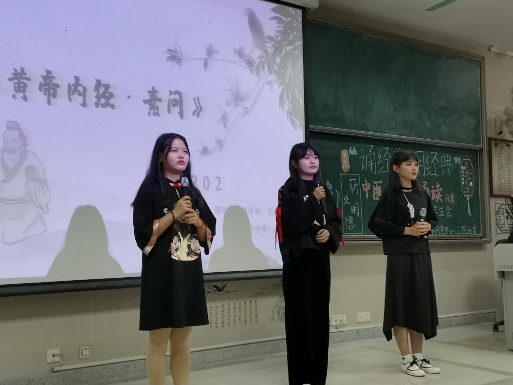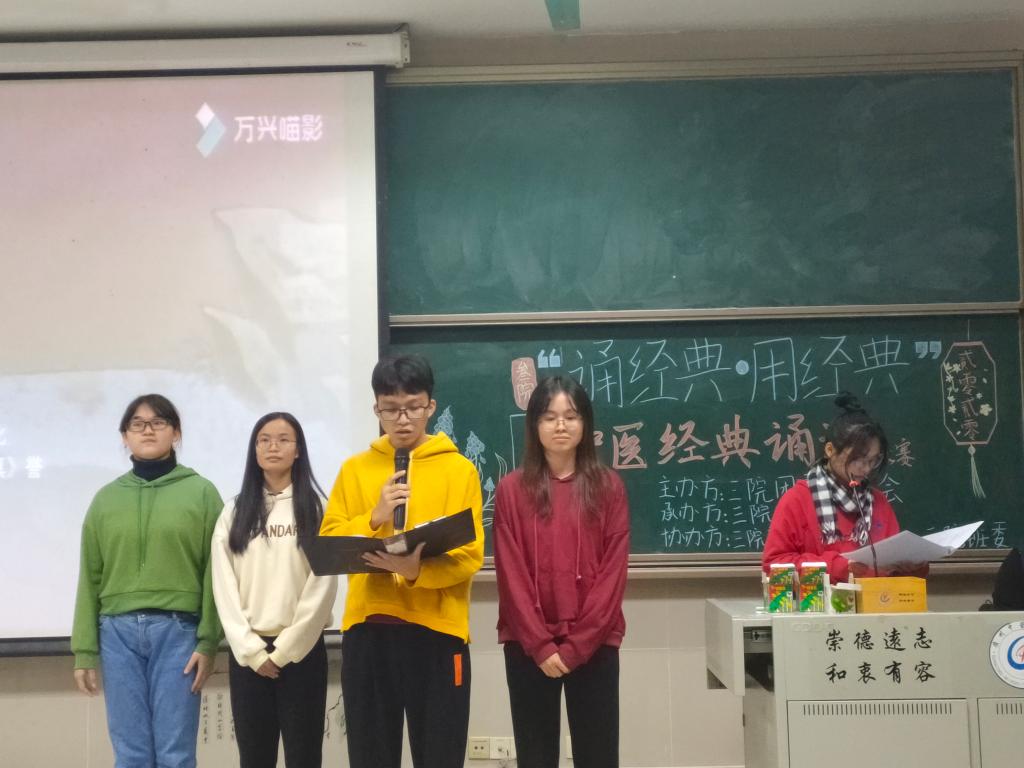 在主持人介绍完在场评委嘉宾后,比赛正式开始,本场比赛由三院19、20级的同学自由组队,最后一共有12个小组参与本次比赛。不同的小组分别截取了《黄帝内经》、《金匮要略》等书籍的经典片段,他们用自己的声音表达出了对经典的理解,用情感表达出了中医经典的文化魅力,把神圣的中医经典展现得淋漓尽致。