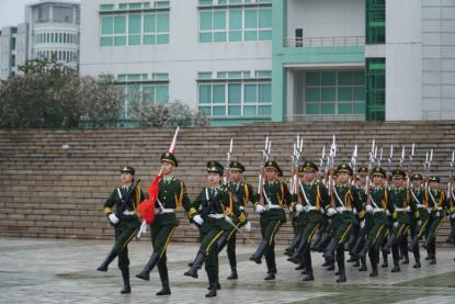 在《分列式进行曲》的歌声中,国旗护卫队的旗手们踏着铿锵有力的步伐,护卫五星红旗向升旗台方向前进。随着《义勇军进行曲》的歌声响起,鲜艳的五星红旗在升旗手的拉动下徐徐上升。三院学子全体肃立,一同注视国旗,心潮澎湃,对中国共产党一百年来取得的成就感慨万千。