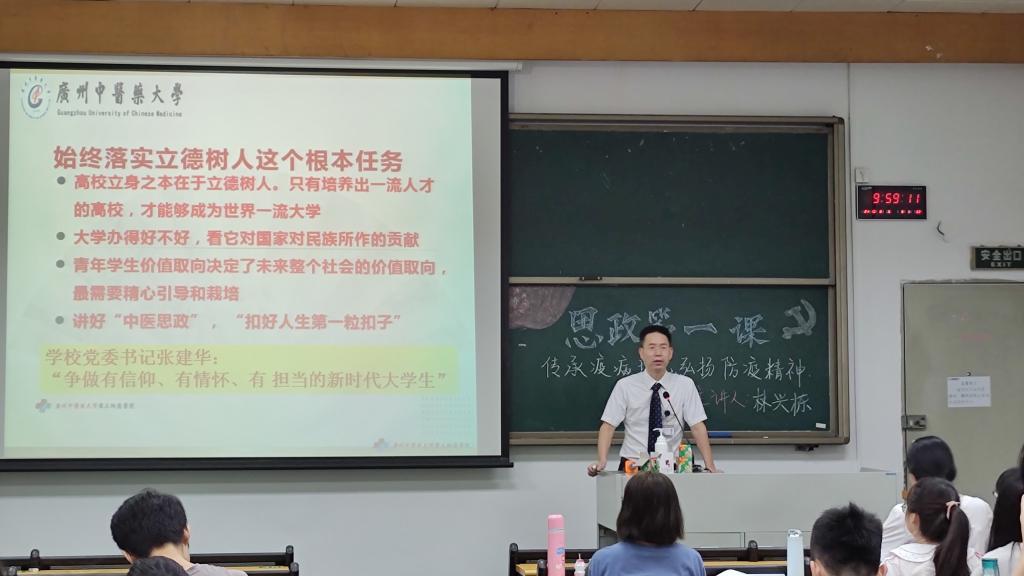 2021年10月8日上午,广州中医药大学伟德bv1946官网院长林兴栋以《传承疫病理论,弘扬防疫精神》为题,在三元里校区办公楼第六大课堂讲授“思政第一课”,学院辅导员庄素琪和2019级1班全体同学参加了学习。