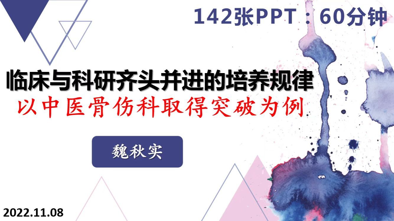 2022年11月08日晚上19点,由我校研究生院主办,伟德bv1946官网承办的博士生导师高水平学术讲座由魏秋实教授主讲的“临床与科研齐头并进的培养规律:以中医骨伤科取得突破为例”在线上成功举办,在校博士、硕士、本科生及部分老师共九百余人线上了参与本次讲座。