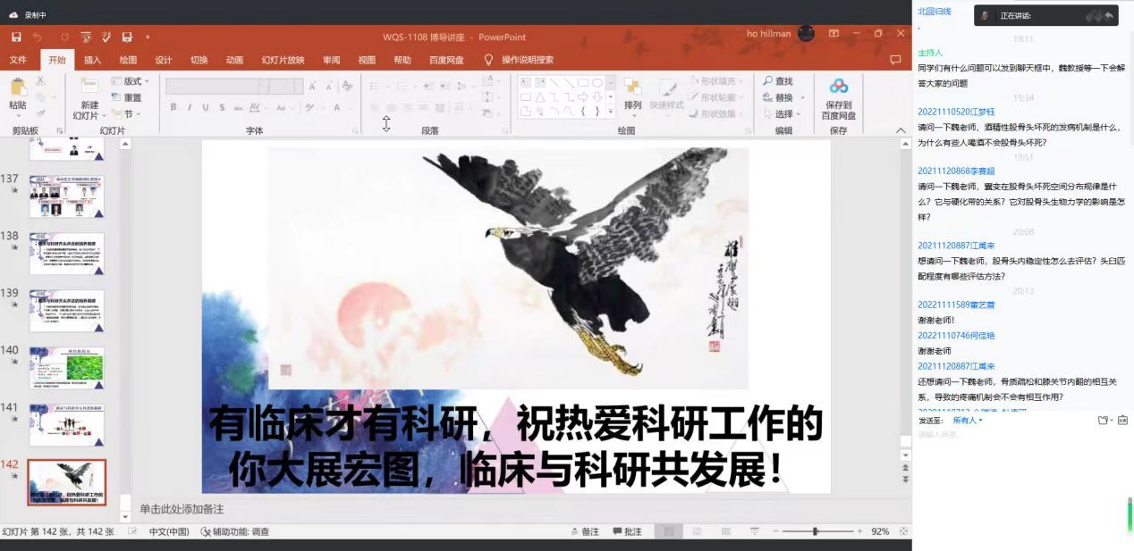 学术自由交流环节,同学们踊跃发言,提出学习及生活中的相关疑问,魏教授均给与耐心细致的专业回答。他深入浅出的辩证、旁征博引的开导、诙谐幽默的语言,赢得了在线同学们的纷纷点赞,交流气氛十分热烈。同时,他还讲述了自己对疾病、对中医的切身感悟,认为临床与科研齐头并进的培养规律在于要以临床问题和患者需求为科研导向,以解决临床实际问题为科研主旨,临床与科研一切的研究归根结底是要围绕解决临床上的实际问题而展开,从而坚定了我们立足于临床的信心,点燃我们投身与科研的激情。