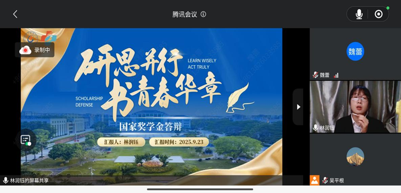 评审会伊始,国家奖学金候选人进行风采展示。经过前期严格筛选,入围最终答辩的各位候选人依次开启视频连线,结合精美的演示文稿,从思想表现、学业成绩、科研创新、社会实践、文体艺术等多个维度,全面而生动地阐述了各自的成长与收获。尽管相隔屏幕,但候选人们饱满的精神状态、扎实的专业功底和突出的综合能力依然清晰可感。他们中既有成绩名列前茅的学术标兵,也有在科研竞赛中斩获佳绩的创新能手,更有积极服务同学、奉献社会的实践先锋。精彩的陈述充分展现了三院学子笃信好学、志存高远的精神风貌,为线上观摩的师生提供了一场精彩纷呈的视听盛宴,发挥了强大的榜样引领作用。