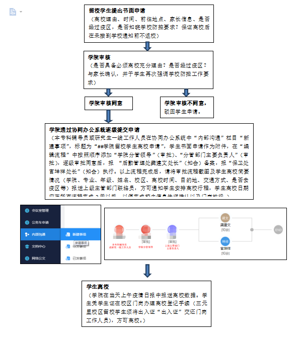 如因重大紧急事件需要离开校园一天以上的,由学生向学院提交书面申请,说明离校原因,离校具体时间、乘坐交通工具及目的地,提供家长联系电话。学院对学生申请进行审核,确认学生不经过疫区,与家长进行联系确认,并要求学生未接到学校返校通知前不可提前返校。学院审核同意后通过协同办公系统逐级提交申报(具体流程见附图),经学校同意后,方可安排行程。学生离校前由学院对学生再次进行健康宣教,安保部门在学生离校时做好登记,三元里校区留校学生须将“出入证”交还安保工作人员。学院跟进学生抵达情况,确保学生安全。